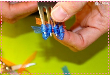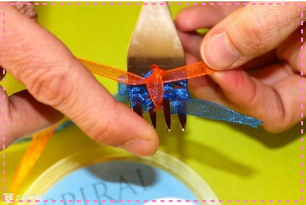 O material que você irá precisar é de apenas fita de organza e um garfo.