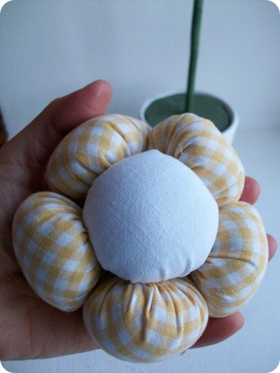 Usando a sua pistola de colaquente, cole agora o centro da flor (bolas brancas), preenchendo as lacunas para obter a cabeça da flor que você vê acima.